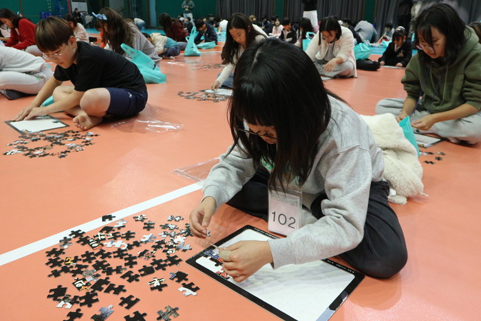 | ▲ 독도퍼즐왕 선발대회에 참가해 퍼즐 맞추기에 여념이 없는 학생들 모습 |