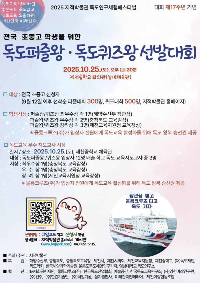 지적박물관(관장 이범관)이 주최하는 ‘2025 지적박물관 독도연구체험페스티벌’ 개막행사 겸 대회 제17주년 기념행사가 지난달 25일 독도의 날을 맞아 제천중학교 실내체육관 화의관에서 성황리에 거행됐다. 전국 초중고 학생 350여 명이 참석한 가운데 열린 이날 행사에서는 독도퍼즐왕선발대회 및 독도퀴즈왕선발대회 이벤트가 흥미롭게 펼쳐졌다.
