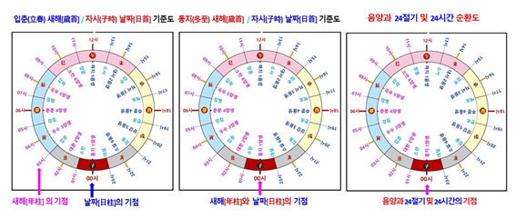 …(중략)…명(明)나라 천문학자 주재육(朱載育)은 자신이 저술한 정통 역법 서적인〈율력융통(律歷融通)〉에서 날짜는 12지지의 첫 번째인 자(子) 즉 정자시(正子時)로 정하고, 새해는 12지지의 세 번째인 인(寅) 즉 입춘(立春)으로 정하는 사주 명리학자들을 일러 “우수(雨水)를 역원(曆元)으로 삼고 원가력(元嘉曆)을 만든 하승천(何承天)보다 더 무식하다.”고 조롱했다. 입춘으로 새해를 정하면 일(日)은 자(子)에서 시작되고, 년(年)은 인(寅)에서 시작되는데 이것이 과연 60갑자의 순환법칙과 맞는 것인가? 그런데 아직도 “사주로는 2월 4일생부터 진짜 소띠다”라는 한심한 사주 명리학자들이 많다는 것은 유감이 아닐 수 없다. 동지(冬至)로 새해를 정하면 갑기(甲己)년에 갑자월이 들어오고, 입춘(立春)을 기준으로 새해를 정하면 갑기(甲己)년에 갑자월이 영원히 돌아오지 않는다는 것은 초보 사주 명리학자도 다 아는 상식이라는 사실을 명심하시기 바랍니다.…(중략)…명(明)나라 천문학자 주재육(朱載育)은 자신이 저술한 정통 역법 서적인〈율력융통(律歷融通)〉에서 날짜는 12지지의 첫 번째인 자(子) 즉 정자시(正子時)로 정하고, 새해는 12지지의 세 번째인 인(寅) 즉 입춘(立春)으로 정하는 사주 명리학자들을 일러 “우수(雨水)를 역원(曆元)으로 삼고 원가력(元嘉曆)을 만든 하승천(何承天)보다 더 무식하다.”고 조롱했다. 입춘으로 새해를 정하면 일(日)은 자(子)에서 시작되고, 년(年)은 인(寅)에서 시작되는데 이것이 과연 60갑자의 순환법칙과 맞는 것인가? 그런데 아직도 “사주로는 2월 4일생부터 진짜 소띠다”라는 한심한 사주 명리학자들이 많다는 것은 유감이 아닐 수 없다. 동지(冬至)로 새해를 정하면 갑기(甲己)년에 갑자월이 들어오고, 입춘(立春)을 기준으로 새해를 정하면 갑기(甲己)년에 갑자월이 영원히 돌아오지 않는다는 것은 초보 사주 명리학자도 다 아는 상식이라는 사실을 명심하시기 바랍니다. |
