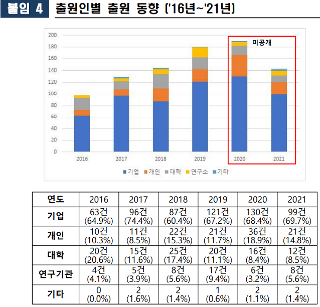 출원인별 출원비중을 살펴보면(‘16~’20), 기업에 의한 출원 비중이 68%를 차지하여 출원을 선도하고 있다. 개인(14%)과 대학(12%)의 출원 비중은 유사하며, 연구기관은 5%를 차지한다.