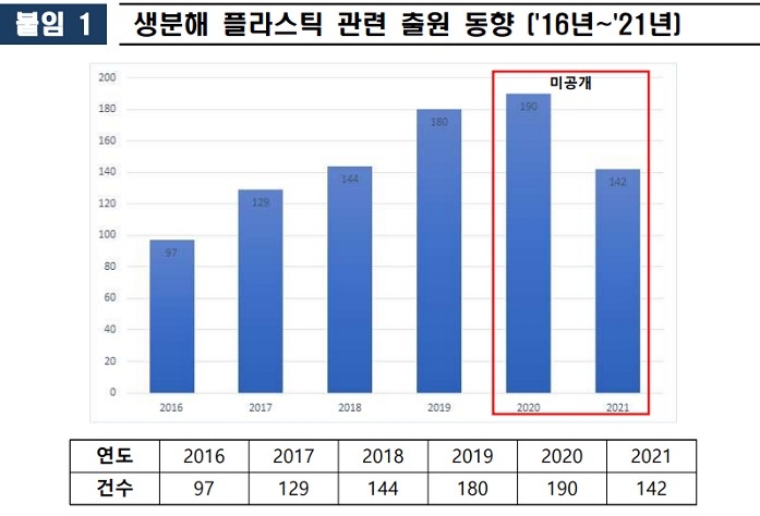 16일 특허청(청장 김용래)에 따르면, 생분해 플라스틱 관련 특허출원이 최근 5년간(‘16~’20) 연평균 18% 증가해 2016년 97건에서 2020년 190건으로 5년 만에 2배 가까이 증가했다.