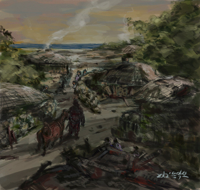 저물어가는 바다를 바라보며 옛 생각에 푹 젖어 있던 이사부의 의식을 깨운 것은 주조 도형이었다. 멀리 마을이 보였다.