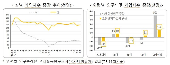 12월 말 기준 고용보험 상시가입자는 1549만 3000명으로 전년도 같은 달보다 18만 2000명(1.2%) 증가했다. 이는 2024년 12월에 전년 대비 16만 명(1.1%) 증가한 것보다 소폭 늘어난 수치다. 천경기 노동부 미래고용분석과장은 "15∼64세 인구 감소의 영향"이라며 "65세 이상은 고용보험에 신규 가입할 수 없으니 고령화에 따른 현상으로 볼 수 있다"고 설명했다.