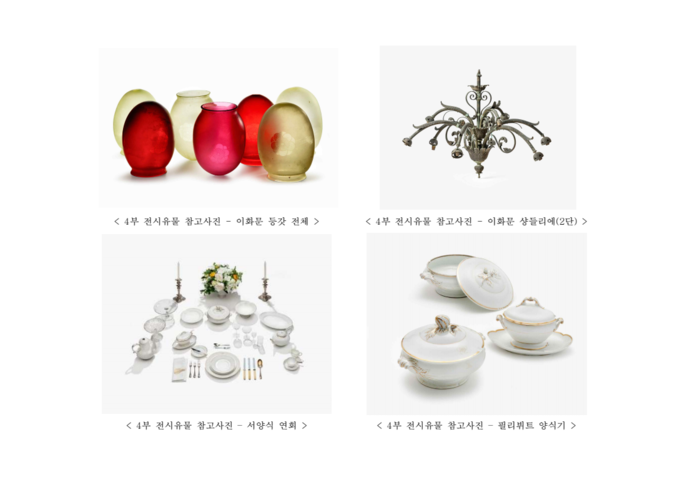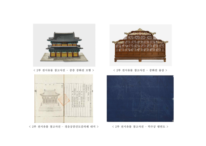 ▲ 1부에서는 대한제국의 선포 과정을 소개하고▲ 2부에서는 『경운궁중건도감의궤』 등 궁궐 관련 유물을 전시하며, 일제강점기 훼손된 덕수궁을 상상화로 복원한다. ▲ 3부에서는 『구한국훈장도』 등 근대 외교 의례 유물을 선보이며, '칭경예식'을 병풍으로 제작한 상상화를 볼 수 있다. ▲ 4부에서는 근대 문물을 살펴보고, 대한제국의 이상향을 담은 상상화를 LED 패널로 구현한 미디어월을 통해 감상할 수 있다.