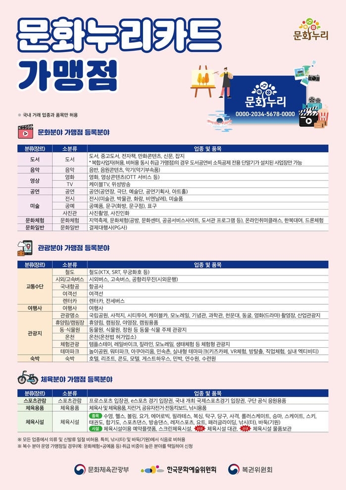 전국 3만 5000여 개의 문화예술, 국내 여행, 체육 분야 가맹점에서 사용할 수 있는 문화누리카드는 다양한 혜택을 제공한다. 영화 관람료 할인, 서점 도서 구매 할인, 프로스포츠 관람료 할인 등 다양한 혜택이 있으며, 문화예술단체가 기부한 입장권 '나눔티켓'도 사용할 수 있다. 문화누리카드 누리집과 모바일 앱을 통해 가맹점 정보와 혜택을 확인할 수 있다.