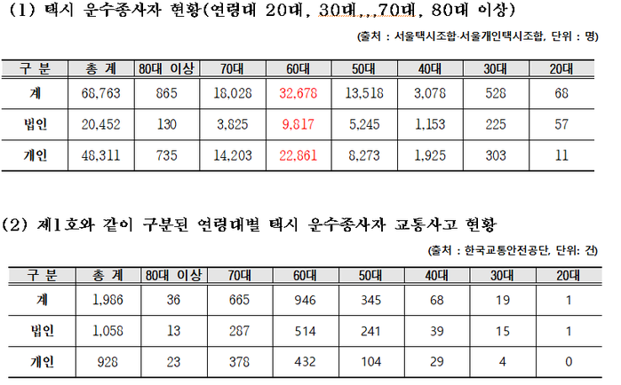특히 개인택시 종사자 중 60대 이상 비율은 무려 78%를 기록, 고령층의 집중도가 높음을 나타낸다.