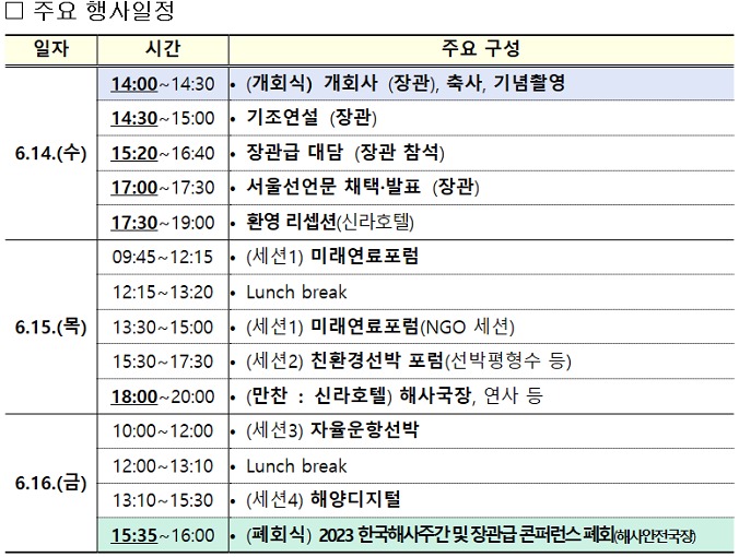 이와 함께 ▲미래연료 ▲친환경선박 ▲자율운항선박 ▲해양디지털을 주제로 하는 4개의 전문가 포럼과 국제녹색해운을 주제로 하는 1개의 비정부기구(NGO) 세션도 마련된다.