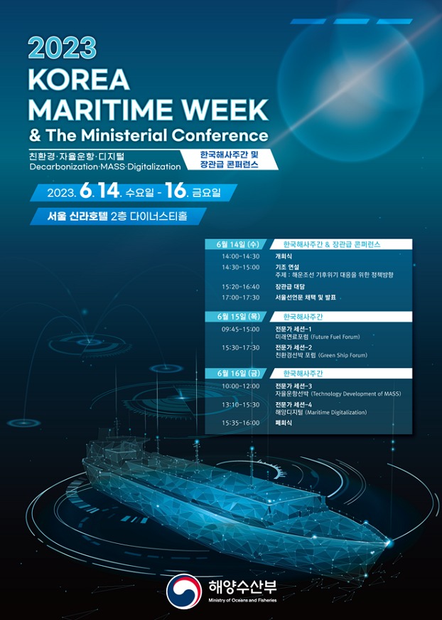 해양수산부는 오는 14일부터 16일까지 3일 동안 서울 신라호텔에서 ‘2023 한국해사주간’과 ‘장관급 콘퍼런스’ 행사를 연다고 12일 밝혔다.