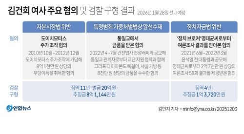 세부적으로 도이치모터스 주가조작 혐의(자본시장법 위반)와 통일교에서 금품을 받은 혐의(특가법상 알선수재)에 대해서는 징역 11년과 벌금 20억원, 추징금 8억1천144만원을, '정치 브로커' 명태균씨로부터 여론조사 결과를 받아본 혐의(정치자금법 위반)에 대해선 징역 4년과 추징금 1억3천720만원을 각각 구형했다.