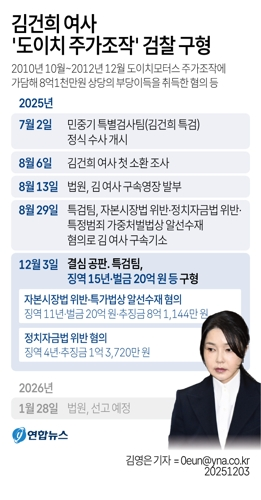 김 여사는 2010년 10월∼2012년 12월 도이치모터스 주가조작에 가담해 8억1천만원 상당의 부당이득을 취득한 혐의 등으로 지난 8월 29일 구속기소 됐다.