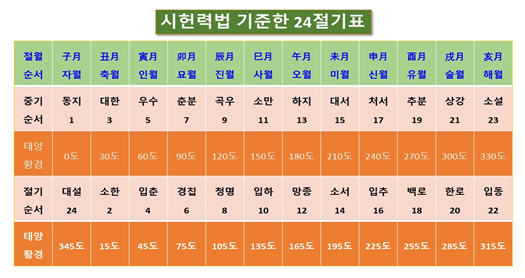 현행 24절기[절기력]와 음력을 정하는 시헌력법은 동지(冬至)는 첫 번째 절기로 태양 황경 0도, 소한(小寒)은 두 번째 절기로 태양 황경 15도, 대한(大寒)은 세 번째 절기로 태양 황경 30도, 입춘(立春)은 네 번째 절기로 태양 황경 45도가 되며…(중략)…대설(大雪)은 24번째 절기로 태양 황경 345도가 된다. 그러므로 입춘(立春)을 1월 절기 또는 첫 번째 절기라고 하면서 태양의 황경은 315도라는 주장은 현행 시헌력법과 맞지 않는 오류이다. 시헌력법으로 24절기를 구분하면 다음의 표와 같다.