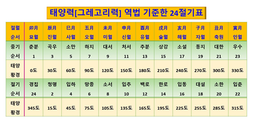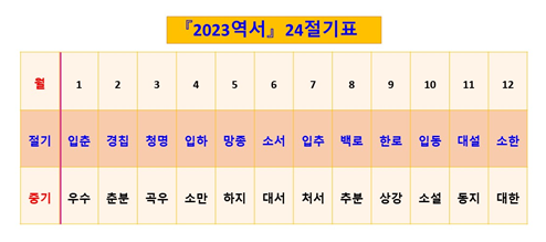 춘분(春分)으로 태양력[그레고리력]의 기산점(起算點) 정했다는『2023역서』와 『만세력』에 적시된 역법으로 24절기를 구분하면 다음의 표와 같다.