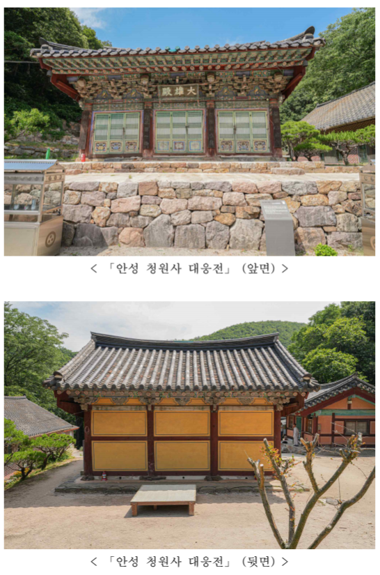 국가유산청은 안성 청원사 대웅전을 보물로 지정 예고했다고 밝혔다. 이 건물은 1854년 대웅전의 공사 내용을 담고 있는 상량문을 통해 그 이전에 건립된 것으로 추정된다. 포작의 세부 장식과 구성 수법을 통해 조선 전기로 건립 연대를 추정할 수 있으며, 수종 분석과 연륜연대 분석을 통해 15세기의 부재로 특정할 수 있다.