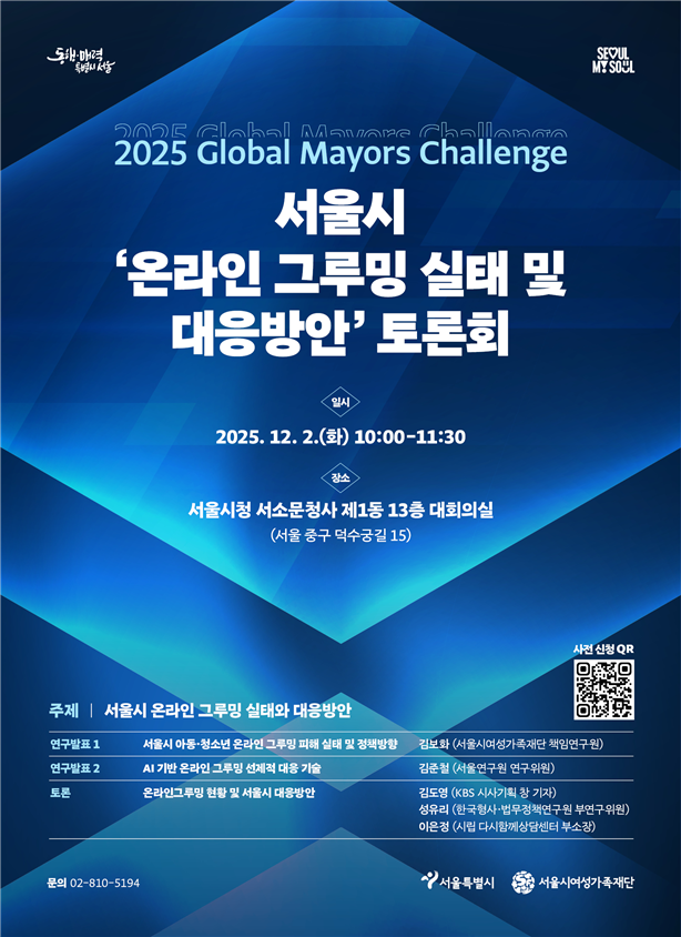 서울시는 2일 서울시청에서 '서울시 온라인 그루밍 실태 및 대응방안 토론회'를 개최해 AI 기반 탐지 기술과 예방 가이드를 소개할 예정이다. 이 자리에서는 서울연구원과 서울시여성가족재단의 연구 발표가 진행되며, 랜덤채팅 실태와 피해 사례도 공유된다. 예방 가이드는 온라인에서의 그루밍 신호를 인지하고 즉시 멈추고 차단하는 방법을 안내하며, 양육자용 가이드는 사건 이후의 심리 반응 대처 방안 등을 포함한다.