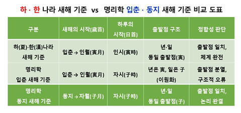 하·한 새해 기준 vs 명리학 입춘·동지 새해 기준 비교 도표