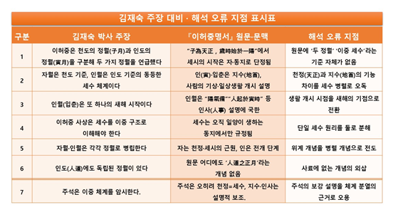 필자는 2009년 5월 26일 데일리안 인터뷰와 『역법의 역사와 역리학의 바른 이해』 171쪽에서 『이허중명서』의 해당 원문을 직접 번역·제시하고, 그 문헌적 근거에 따라 명리학의 새해(年柱)는 동지(冬至)임을 이미 논증한 바 있다. 이에 대한 학술적 검증은, 우선적으로 해당 번역과 해석의 타당성 여부를 다루는 데서 출발해야 한다. 그러나 김재숙 박사는 필자의 원문 해석에 대한 옳고 그름도 명확히 입증하지 않은 채, 제3자의 해석을 근거로 “천도와 인도의 두 가지 세수를 말했을 가능성을 고려해야 한다”라는 모호한 가능성을 제시하며 필자의 주장을 비판했다. 이는 텍스트 해석의 진위를 검증해야 할 핵심 쟁점을 흐리는 태도로, 학술 비판이 아니라 논점 회피에 불과하며, 곡학아세라는 비판을 면하기 어렵다.